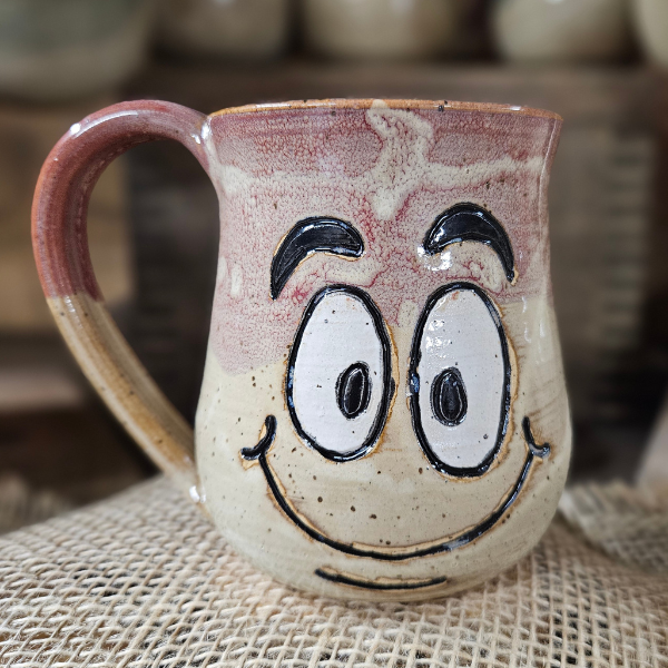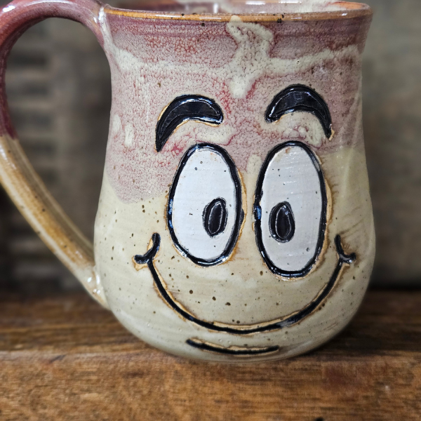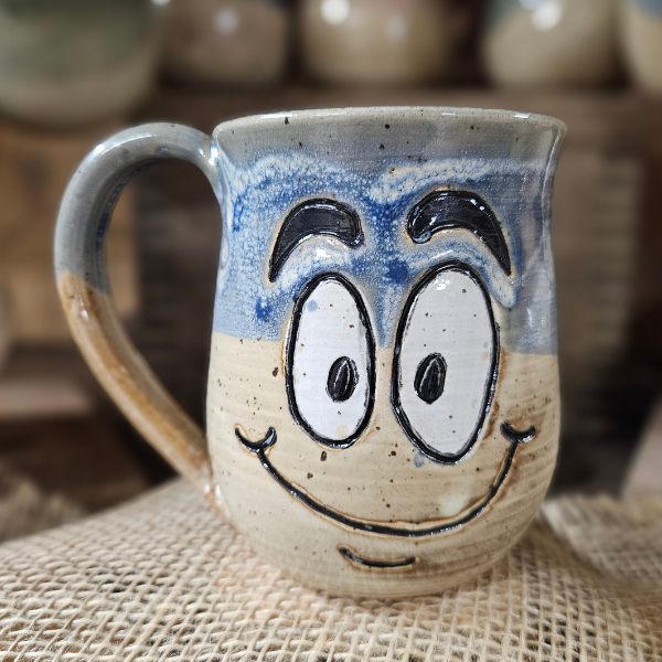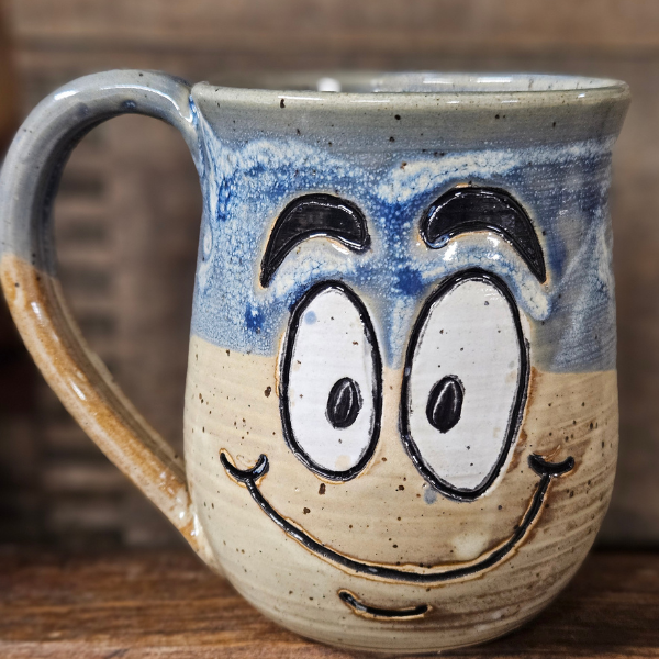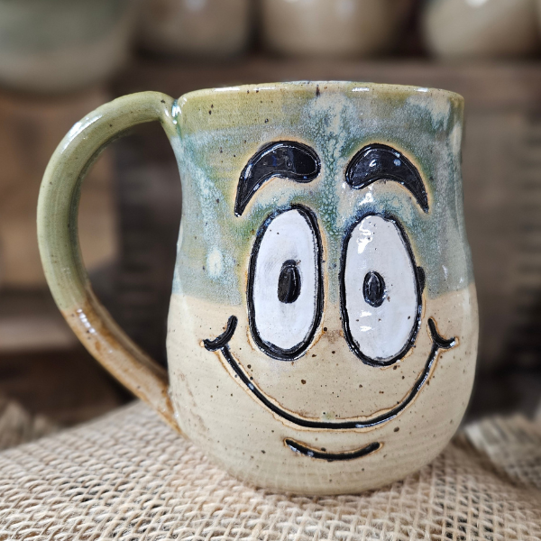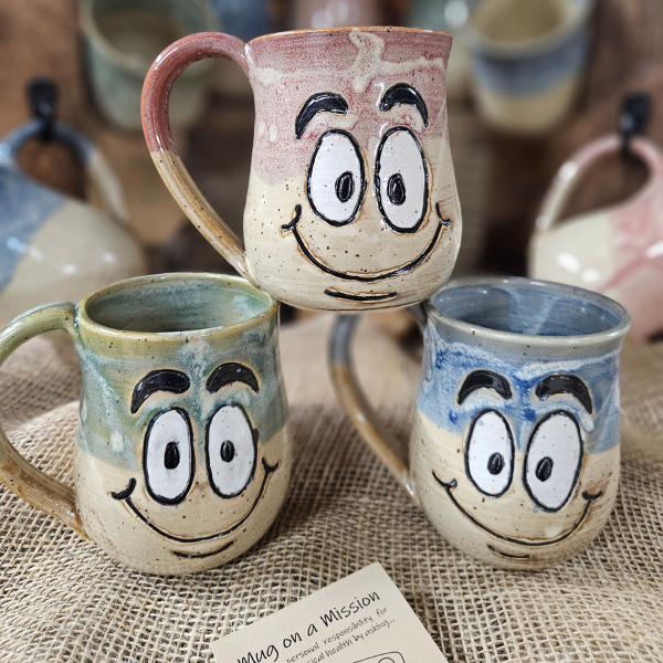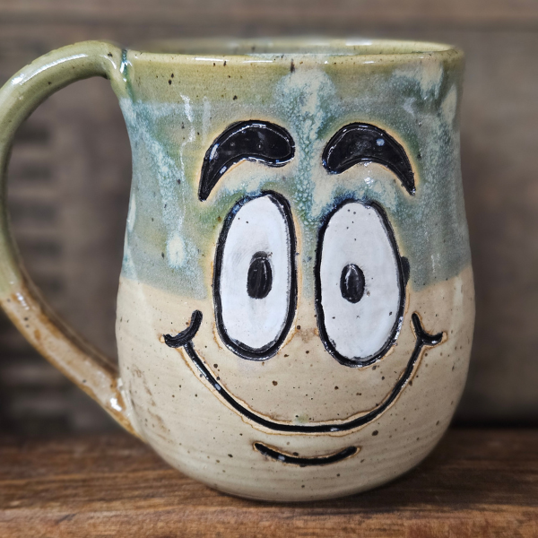 A 12 oz handmade stoneware mug with a whimsical face and mindful message. Choose from