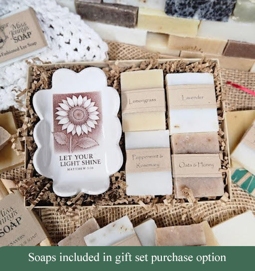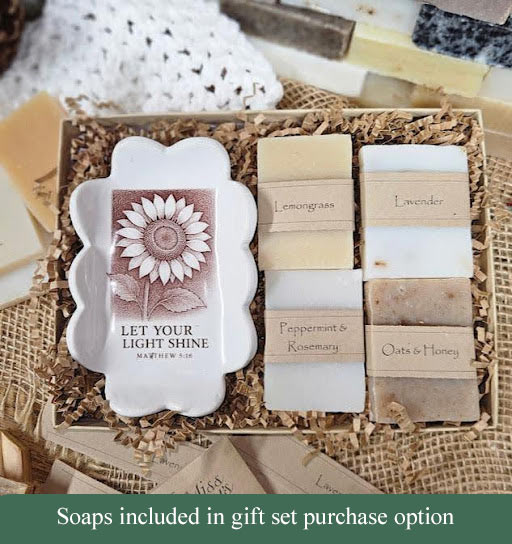 Make your sunflower soap dish extra special! For just $10 more, we’ll package it in a kraft gift box with 4 handmade sampler soaps: